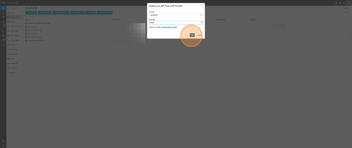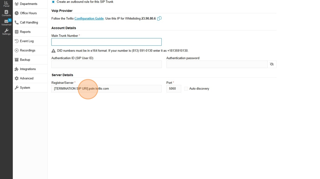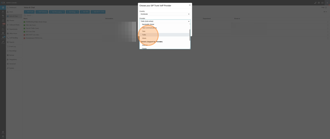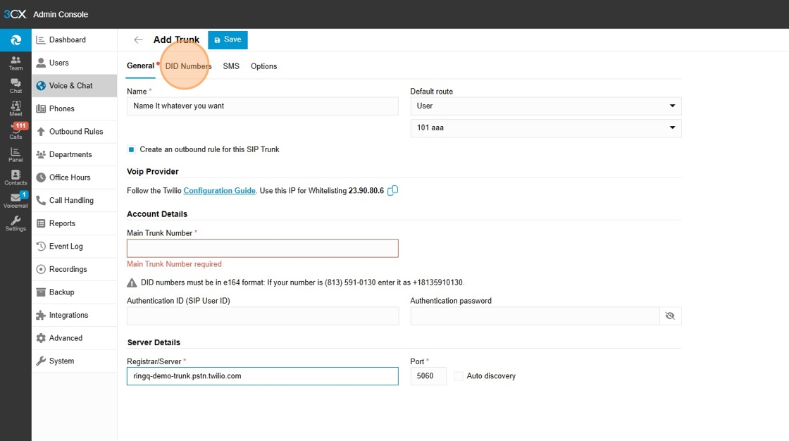 On 3CX 1. Navigate to SIP Trunks→Add SIP Trunk 2. Select “Worldwide” for country 3. Select the “Twilio” trunk template 4. Input a Main Trunk Number 5. Input your “Registrar/Server/Gateway Hostname or IP” matching what your current Telin trunk has or ...